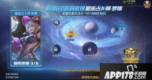 活动简介:我们的征途是星辰大海,解锁6个区域必得180钻+星座占卜师 罗娜,选择1个区域瓜分1亿瓜份,奖励钻石上限提升,最高瓜分500钻!