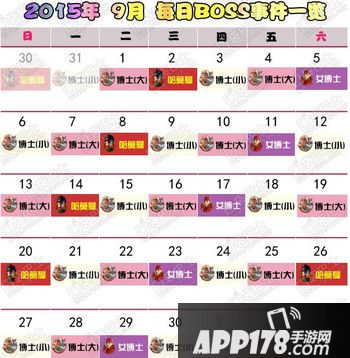 APP178手游网>海岛奇兵>游戏攻略>海岛奇兵9月每日BOSS事件月历图大全