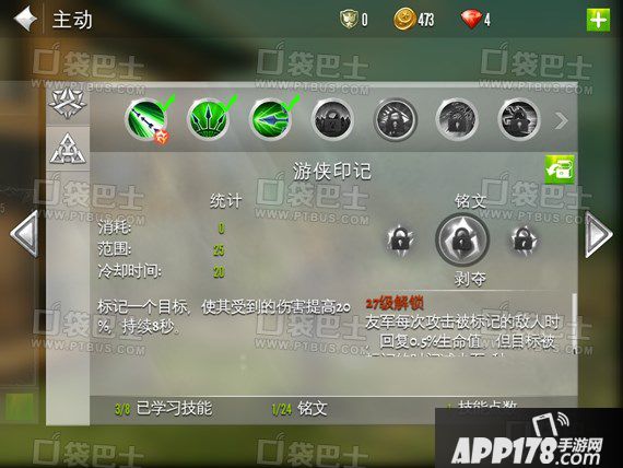 游侠印记:点名敌人造成额外伤害,属于爆发性技能,有点是无能量消耗。三个铭文分别是屠戮、剥夺和稳定。需要AOE的场合选择屠戮,而稳定适用于PVP和PVE的所有单点场合。