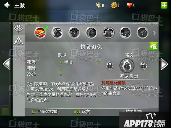 怒火复仇:可以造成物理攻击并回复血量。三个铭文分别是强击、活力和猛击。强击额外造成伤害,是PVE输出用铭文;活力额外回复生命值,坦克用铭文,PVP也有使用空间;猛击能昏迷敌人2秒,PVP天赋。