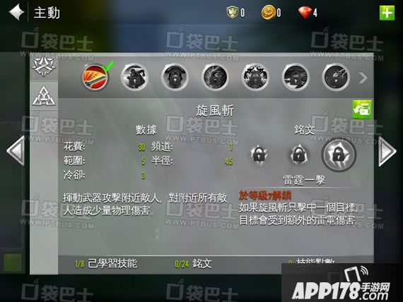 旋风斩:顾名思义,就是原地转圈。三个铭文分别是狂风、干扰和雷暴。狂风是PVE铭文,主要用于杂兵时的AOE;干扰时典型的PVP天铭文;而雷暴则是打单体BOSS输出时的伤害技能之一。
