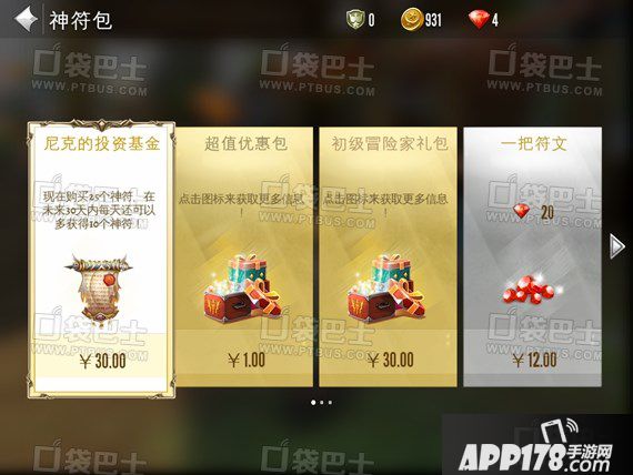 随便点开一个功能性的按钮,右上方就会出现一个加号按钮,点击它就可以进入符文购买页面。游戏中有各种各样获取符文的购买方法,其中绝对超值的就是各种礼包和尼克的投资基金。尤其是尼克的投资基金,30RMG就可以换取一月325的符文,而已普通方式购买的话只能拥有大约50符文,可谓是收益率6倍有余。