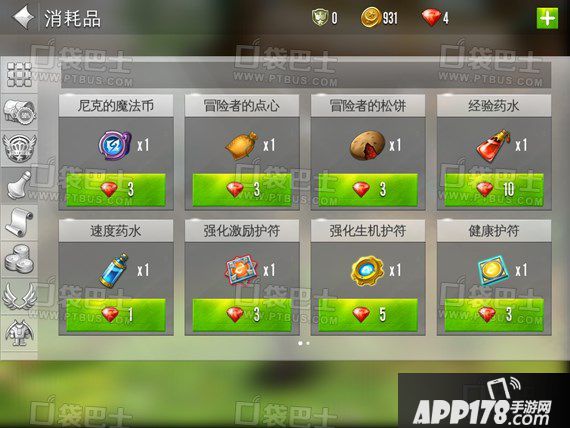 第四栏是消耗商品。包括各类药水和强化护符等;这里推荐一下尼克的魔法币,第一次用的话就可以扩大8个物品栏位,当然以后会逐级提升(比如第二次提升需要5个尼克的魔法币)。