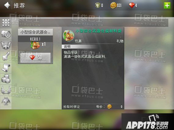 第一栏是推荐商品。这里的都是物超所值且前期就能发挥巨大作用的,虽然目前只有一个商品。不过可以肯定的是合成材料袋中有前期武器升星必备且非常难得的陨铁粉,如果充了钱且脸黑如非洲人的玩家来时来一发的比较好。