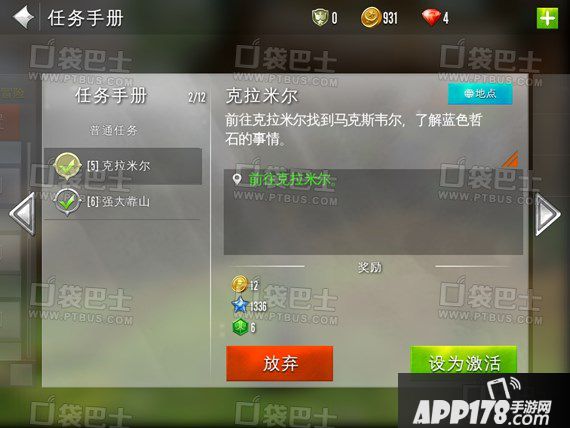 左侧可以选择对应的任务,右侧写着任务内容和奖励。蓝色按钮点击会显示地图,红色按钮表示放弃该任务,而绿色按钮表示将该任务显示为首要任务,并在主界面左上角的小地图上面显示方向。