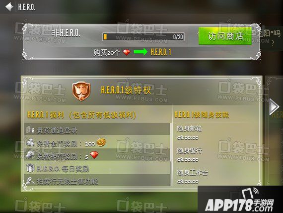 首先就是HERO.1(打标点实在太麻烦了,大家都就好),首先就是只要充值,基本上都能到达这个等级。这个等级的最大优势在于每天能多领取相当数量的资源,同时开启了拍卖行无限出售功能,以及贵宾通道的快速登录。而且三个随身的便捷功能也已开启,虽然有长达8个小时的CD,但是总比没有要强啊!
