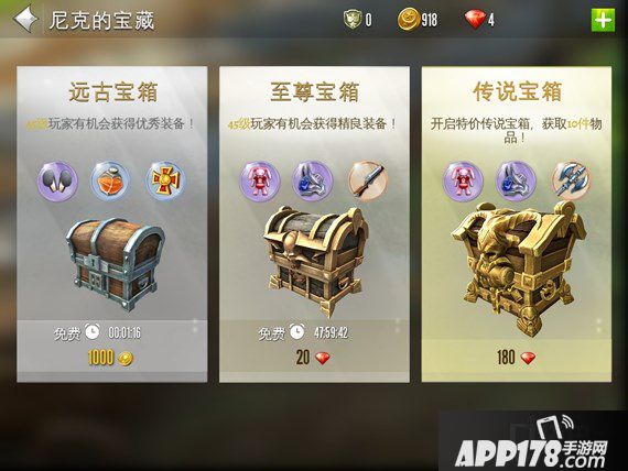 传说宝箱:钻石抽奖,180红钻抽一次,能获取10件装备,且获取传说级装备的概率大幅度提升。