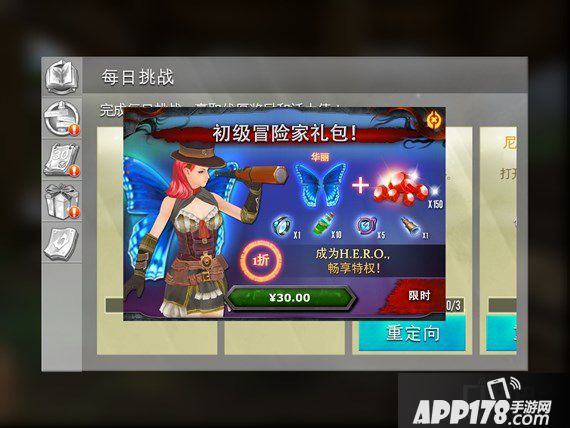 初级冒险家礼包内容:蝴蝶翅膀,红钻*150,戒指*1,大经验药水*10,答活力药水*5,望远镜*1,H.E.R.O.(VIP)特权。