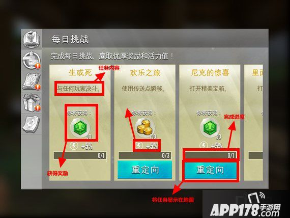首先每次进入游戏时,都会自动跳转到每日任务的界面。在游戏中,称之为信息中心。