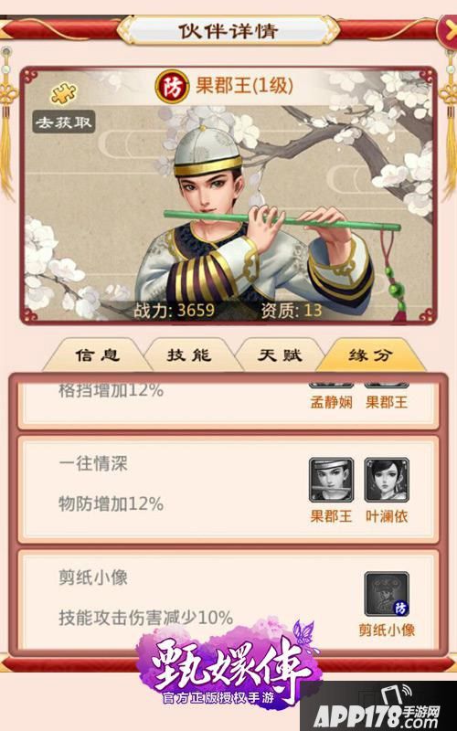 果郡王在倚梅园无意中见到甄嬛的剪纸小像,虽未见其人,却在心底萌发了爱意。两人相知相爱之后,这枚小像更是成了果郡王的心爱之物。在《甄嬛传》手游中,这枚甄嬛无意中遗落的小像,则是果郡王的缘分信物,当果郡王装备剪纸小像时,受到的技能攻击伤害将有所减少。
