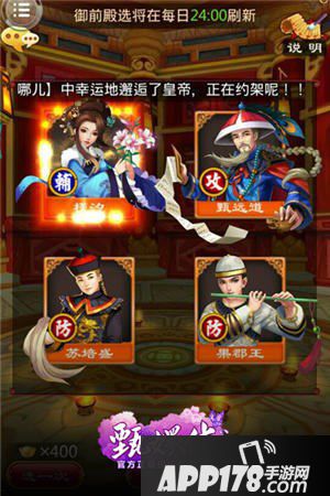 随着新一年的到来,「甄嬛传」手游也有了进一步的改进。首先,宝石转换玩法正式开放,不同属性之间的宝石可以相互转化,妈妈再也不担心我的宝石属性不对啦!同时,殿选玩法也全面展开,橙色伙伴唾手可得!殿选是获得稀有资质伙伴的一个重要手段。有单次抽和十连抽两种形式,将百分百获得橙色资质的伙伴魂魄!最后,世界BOSS也将开启自动战斗,点击“自动战斗”后,在世界boss未被击倒的情况下,每次战斗后只要冷却时间结束便会展开新一轮的战斗,并自动释放技能。世界boss如果当天没有被击杀,第二天血量也会有所减少,为小主们降低难度。