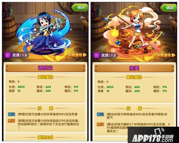 随后,在升级过程中玩家们还可以替换紫卡,毕竟消耗的海魂比较少,容易出卡,不会卡资源。目前版本中,紫卡强势的有三张,分别为山治、巴基、达斯琪(游戏内名字分别为山智、巴奇、塔系米)。山治施放技能后无敌一回合,同时降低敌方2点怒气,无比的强势,站在最前面,能抗住所有伤害,同时还能控怒。巴基释放技能后随机给两个小伙伴加血并加一点怒气,也是很BT有木有,不过加血对象随机这个比较不好控制。除此之外巴基被普通攻击时还有50%几率免疫100%伤害,也是很厉害的。达斯琪,普攻与怒攻都是打血量最低的,及时补刀对方残血卡牌,第一时间降低对面战力。但是小编推荐先换达斯琪,因为此卡影子掉落的副本开得非常早,配合伙伴商店可以早早换出来,不会拖进度。