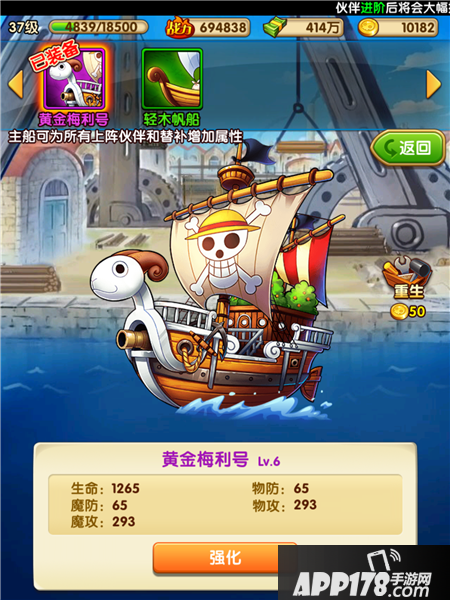 我们可以更换主船为梅利号就已经可以增加一定的属性了,之后在将船只强化又可以大幅度的增加属性。