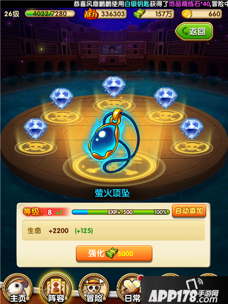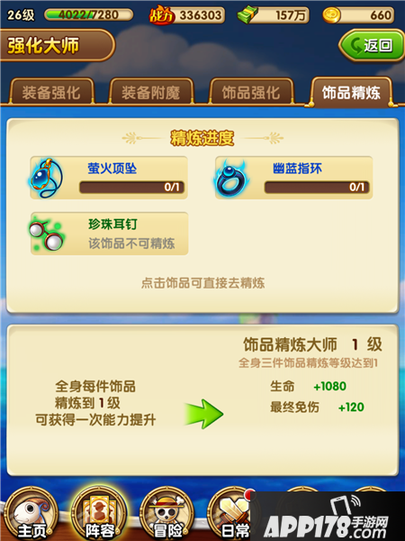 饰品的升级可以提高饰品的属性,提升我们的战斗力。饰品的等级只有英雄等级的一半,想要升级饰品就需要消耗经验钻石和贝里。