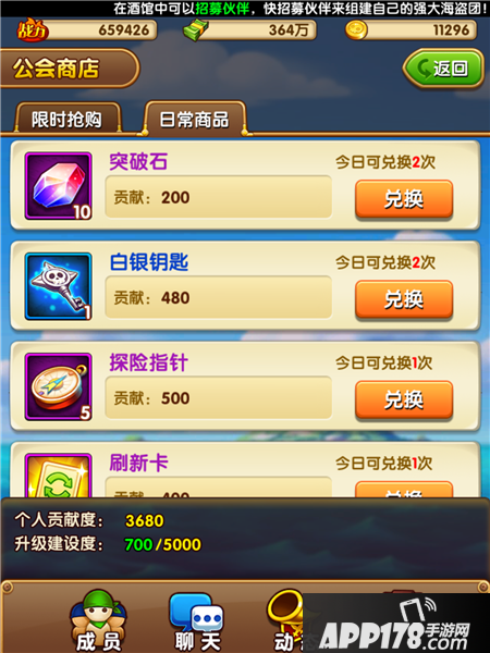 我们只要获得足够多的公会贡献,就能在公会商店中去兑换突破石了。商会的等级越高我们每日可以兑换的突破石也就越多。