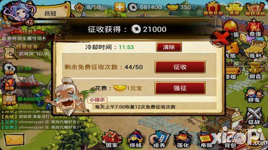 一、官府征收,玩家第一进去游戏会获得50次征收的机会,这个数字是玩家征收次数的最大值,以后每天7点恢复12点,因此每天至少保留12次征收空余。征收时会随机获得藏宝图碎片,玩家可以组队凑齐上、中、下可获钱币奖励;