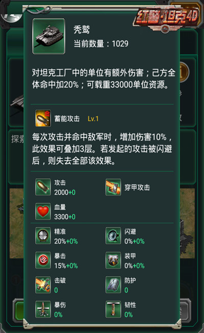 秃鹫坦克,采取横排穿甲攻击模式。无论对方防御达到多少,秃鹫坦克始终能维持一个较高水平与稳定发挥,达到每下2000,血量与载重均在3300的较为偏 上的水准,使得秃鹫坦克在防御和载重方面也有独到应用。最为亮眼的是,秃鹫坦克那20%加成的精准与15%加成的暴击,使得它即使是处于无配件状态也能发 挥高性能的精准命中与暴击伤害,在同种坦克的对拼中,秃鹫坦克完全可以用“零缺点”形容!