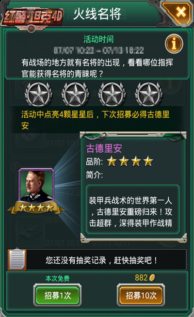 听说在3k玩《红警·坦克4D》中,秃鹫配四星名将古德里安更配哦!据悉,在本次活动中,除了有秃鹫和可以改造秃鹫之外,还有指挥歼击车高手(名将)出现哦!只要在活动中点亮4颗星星,下次招募就可以获得歼击车高手古德里安哦!