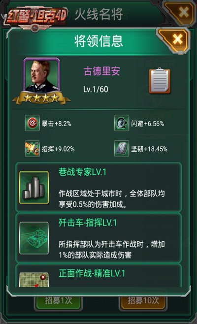 据了解,四星名古德里安有巷战专家技能,当作战区域处于城市时,全体部队均享受伤害加成!且重点是,古德里安能够指挥歼击车,当古德里安所指挥部队为歼击车时,将增加部队实际造成伤害!当然,这都不是全部!总之,古德里安,你值得拥有!