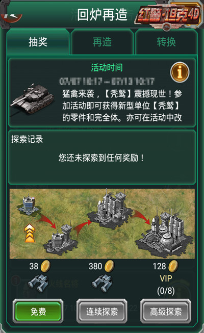 在3k玩《红警·坦克4D》中,只要在活动时间通过探索即可获得秃鹫坦克的零件或者完全体!除此之外,还可以在活动中改造秃鹫!但是,在活动中,玩家每次只能探索1个地点,每次有一次免费探索的机会..当然,有钱能使鬼推磨,你懂得!