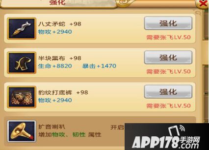 武将张飞装备的强化也会对他的战力提供强大的保障,张飞的每一次升级都会开放相应的装备强化,几件装备的强化开启都有一定的开启条件。完成相应的条件就会获得强化的条件。强化需要大量的蓝田玉,培养张飞时要准备一定的数量。