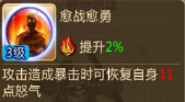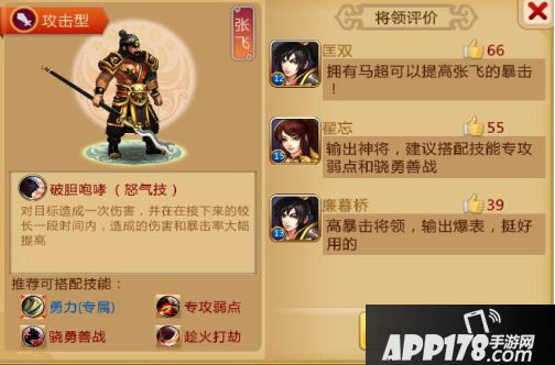 首先wuli来理解一下张飞大大的技能。武将张飞的怒气技能破胆咆哮会使他在接下来的一段时间内造成伤害和暴击大幅提高,可以看出张飞是一个靠暴击物理输出的强力武将,搭配上他的专属技能勇力,会更加提高张飞的输出能力。我在这里还要另外推荐2个技能来搭配张飞,一是技能越战越勇,这个技能可以提高张飞暴击输出的续航能力,使得张飞在很长一段时间内持续爆炸输出;二是技能趁火打劫,张飞持续的暴击输出可以造成额外的伤害,对张飞这种单体输出暴击伤害高的武将来说是一个非常强力的技能。