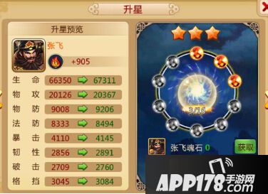 武将张飞升星同样需要大量的魂石,依旧是可以通过酒馆招募武将的过程获得魂石或是击杀野外橙怪,这里我想说到的是酒馆中再次招募到张飞的话会获得六十个张飞魂石,这个数量还是非常可观的。张飞每个星级的提升都会获得很大的战力提升,所以武将升星在胡莱三国2中对培养武将是非常重要的。