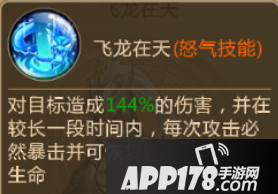 赵云是一个攻击型的武将,他的怒气技能飞龙在天,对目标造成伤害,并在较长一段时间内,每次攻击必然暴击并可恢复一定比例的生命。