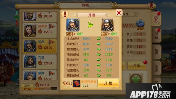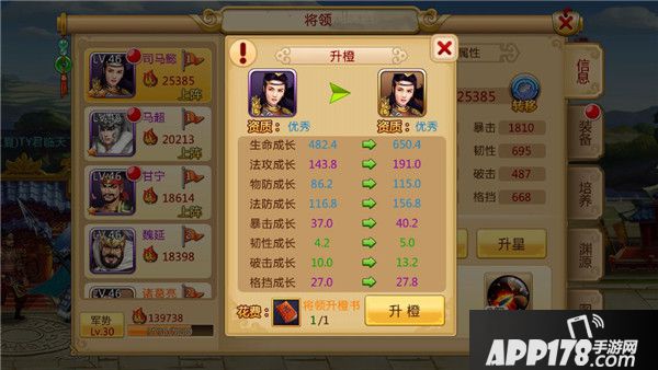 以上是紫将升橙和蓝将升橙的对比图,不难发现,由于紫将初始能力较高,因此在升橙后,属性提升并没有蓝将升橙高,因此无论是什么品质的将领,在升橙后其属性是相差无几的。
