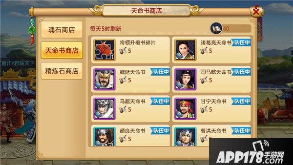 除了活动会送外,我们还能在商店里通过消耗5个天书残页兑换1个碎片,而天书残页则可以通过分解将领天命书获得。将领天命书又能通过将领魂石合成。所以一整套流程就是:获得魂石→合成天命书→分解为天书残页→兑换升橙书碎片。