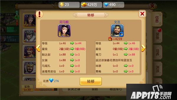 在将领的信息页面,我们可以通过转移把一个将领的能力转移给另一个将领,包括等级、星级、装备强化等级,因此如果发现培养错将领的话,记得运用好这一功能。