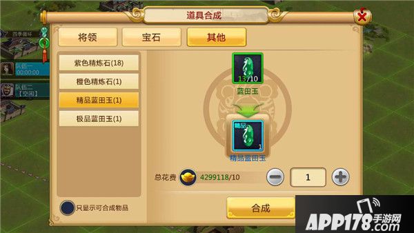 蓝田玉可以合成精品蓝田玉,用来强化高等级的装备。但并不推荐合成,因为这个过程是不可逆的,而且分解40以上的装备不会获得蓝田玉。因此如果后期得到一个新武将的话,蓝田玉的数量会很缺。