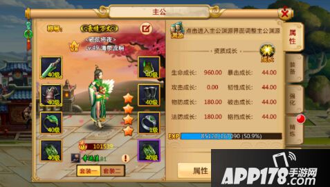 在属性界面可以看到主公所穿戴的装备,称号,星级和主公的详细属性,主公所穿戴的装备与星级是主公战力提升的主要途径,主公渊源与武将渊源一样渊源武将的星级越高,渊源武将的人数越多,提升的属性与战力越多。