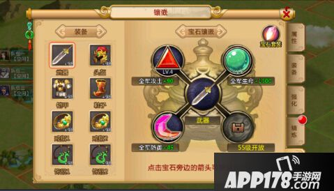 当主公官职到达一定程度时即可开启镶嵌,镶嵌可以提升主公属性,镶嵌开启后首先开启三个镶嵌槽,暴击镶嵌槽需要55级才可以开启。宝石可以通过合成来升级,等级越高的宝石提升的属性越多,并且宝石拥有套装属性。