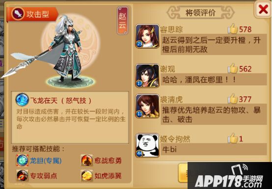 第三:宝宝推荐攻击和防御均衡的万金油的武将放前排,赵云赵子龙是不二人选,6元首冲礼包所获武将,造型霸气,实力非凡,是新手玩家必用武将VIP1到VIP8礼包都有赵云培养材料,可以轻松上三星,可以做为输出也可以做半肉半输出。