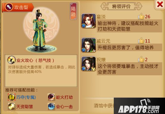 第二:宝宝心目中当属陆逊陆老师,同样的单体高爆发,可以说放到队伍里面,非常的有威慑力,建议搭配技能,乘火打劫和天资聪慧。