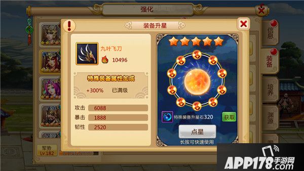 最后一个就是特殊装备的升星,现在每个装备目前都能升到5星,而升星所需要的石头在战役商店里有售,一件装备从0升到5星满的话需要消耗1660个升星石,但能获得300%的属性加成,是提升战力的快速方法。而且分解装备的话,升星石是会全部归还的,请放心大胆去升吧