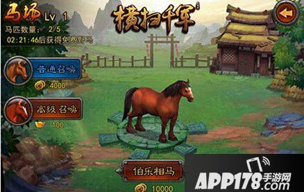 相较于三国乱世的名驹难求,《横扫千军》中名驹的获得方法可就简单了许多。首先召唤出野马,然后再伯乐相马就可以获得宝马啦,在相马的过程中还有几率获得龙马碎片,从而合成威力强劲的橙色战马。