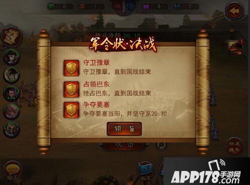 4,【召集令】—>【突进】—>【召集令】—>【包围】:利用召集令大量集结,瞬间形成可以突进的关卡,突进以后在关卡后方城池再次集结,包围关卡。