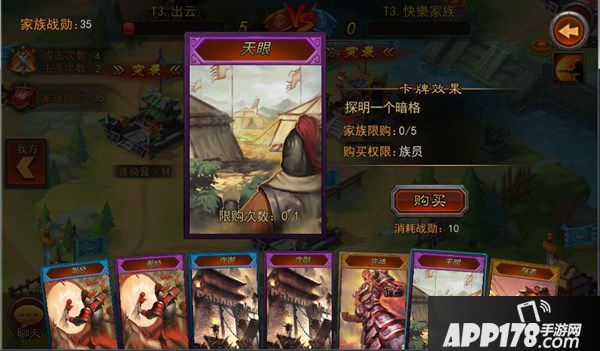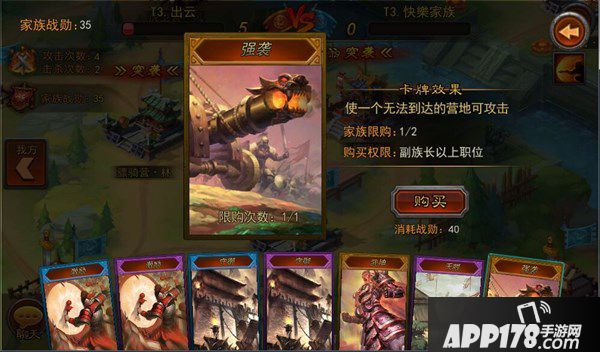 与国战中的策略卡相似,5.0版本的家族战中加入了”锦囊妙计”按钮,锦囊卡通过家族战勋兑换,除了增幅buff外,还有天眼、强袭和武神三类强力锦囊,帮助家族攻坚。
