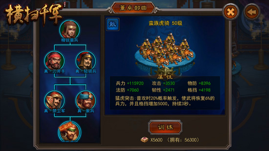 【蛮族虎骑】技能猛虎突击:普攻时20%概率触发,使武将恢复6%的兵力,并且格挡增加5000,持续3秒。