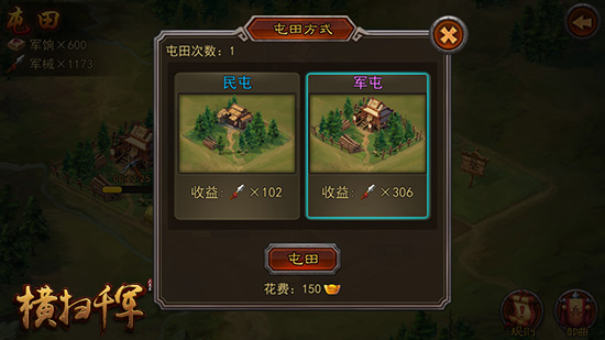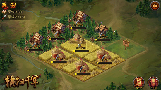 每次军屯为单块农田带来30点经验,每次民屯带来10点经验。农田经验达到要求后,消耗铁矿进行农田升级,可以增加农田的产出。军饷用于兵种训练,军械用于激活新的兵种,收获军饷和军械时,有几率触发风调雨顺和五谷丰登效果,获得额外收益!