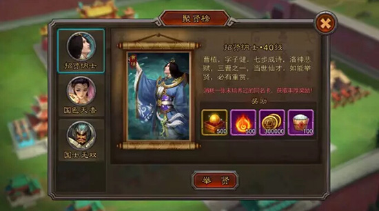 在《横扫千军》8.0版本中,主城的主殿建筑将新增“聚贤榜”,勉励主公举贤任能的表现,上交一张未培养过的任务需求卡,即可将少有出场的绿将、蓝将以及紫将兑换为珍稀的资源和材料。只需达到指定等级,即可通过消耗一张指定武将卡的方式完成招贤任务。