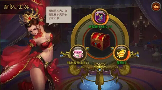 除了聚贤榜的福利任务之外,8.0版本中到达150级的主公在主城中会出现宝石商人的商队,完成商队任务,即可获得高级宝石袋的奖励,福利加倍!商队任务是较为简单的收集类任务,收集指定数量的材料后,即可与宝石商人交易,获得丰厚的高级宝石袋。