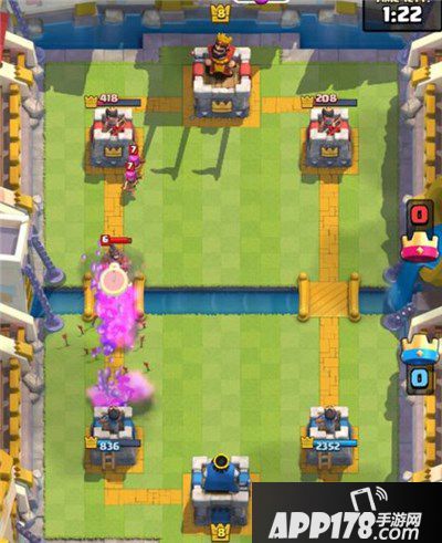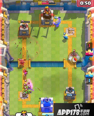 比赛来到双倍圣水时间,我下法师解掉对面一堆过河生物,然后打算下王子进攻。