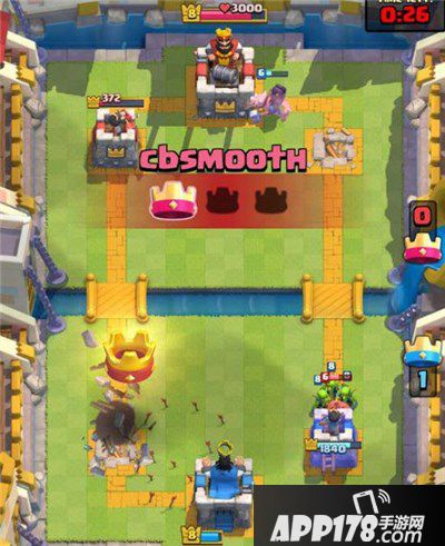 我下王子而不下野猪的原因是之前我骑士+投矛对手出了两种哥布林,又下了两个箭手解所以此刻对手是没有小生物抵挡我王子冲锋的,对手猪+法师过牌防守找小生物,被我白吃一只猪。