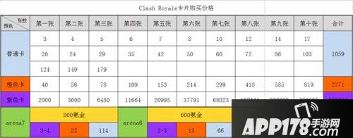 首先是尽量不要去抽箱子,箱子给你的卡很随机,大部分都是你不需要的卡,步入把你的宝石换成金币,这样只买自己需要的卡,性价比更高,下面我放一张买卡的价格表,大家可以自行评估购买力,买到第几张合适