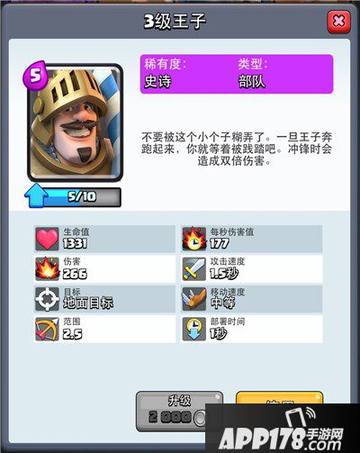 王子作为A0就可以解锁的基础紫卡,一直很热门,因为王子基础属性优秀,还具备冲锋双倍伤害技能,是早期为数不多的单兵能够对防御塔造成极大伤害的兵种,当之无愧地成为了很多玩家最喜欢的卡牌之一。王子手持长毛,具有2.5的射程,这一点让王子对抗近战单位始终是先手,同时一段距离即可发动冲锋技能,造成双倍伤害,突击能力很强,能够秒杀很多输出单位和脆皮建筑,很容易打开局面,同时优秀的血量也让王子能够担任副坦克的角色。