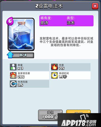 雷电法术作为大范围指向性法术,特殊性在于只攻击范围内3个生命值最高的目标,应用背景讲究,6费的消耗能否赚到费用,选择目标非常关键。大致计算一下对皇家塔的伤害值2费,雷电另外电死的2个单位超过4费就是赚的。其实雷电法术的应用主要是消灭关键目标和消磨皇家塔血量,比火箭更灵活,当然应用难度也更大。