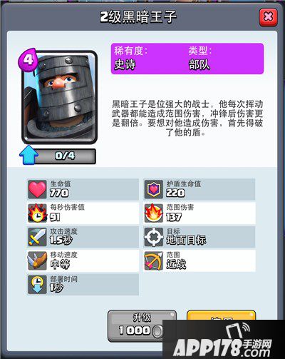 黑暗王子拥有和王子的类似属性,优秀的身材、良好的突击和防御能力,冲锋双倍伤害,中等的攻速和移动速度。黑暗王子虽然没有王子2.5的射程,但是附加了盾牌和群体伤害能力,同时费用只需要4费,大大提升了黑暗王子对各种局面的适应性。群体伤害弥补了王子害怕小单位的缺点,相对的伤害也有所降低,不过亏费的情况也少一些;盾牌具备生命值,在盾牌被摧毁之前黑暗王子的血量不会降低,简单说来就是及时盾牌只有1血,黑暗王子还能够承受2次以上的攻击,不要拿高伤害法术去攻击依然有盾牌的黑暗王子,所以黑暗王子面对高伤害慢速攻击时非常耐揍,坚实的盾牌和不错的血量让他成为了一个可靠的多面手,双王子共同冲锋的威胁不可小觑。相对于王子,黑暗王子的特性和费用让他略比王子优秀一些,虽然单挑打不过王子,但是应对各种场面都能够较好发挥,不至于亏费,个人认为总体评级略高于王子。